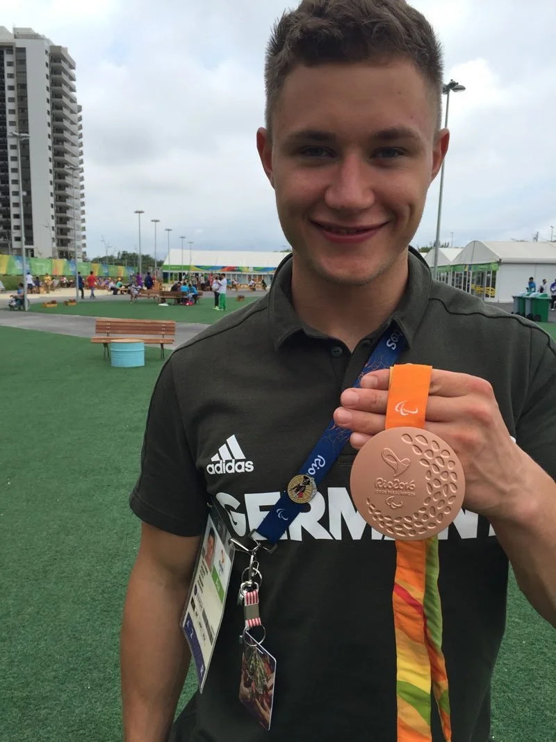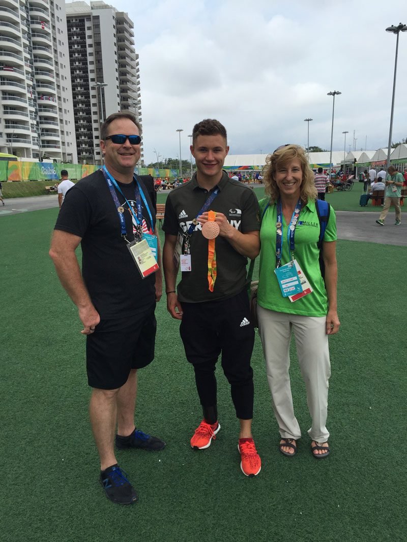 At the Village, security was tight as expected. We had to submit our passport information in advance, which was matched with our passport that was held at the Village while we were inside. We were greeted by Beate Hilpert, from Ottobock’s German headquarters. We immediately encountered an athlete from Germany, Felix Streng, who had just won the bronze medal for the 100 meter dash!