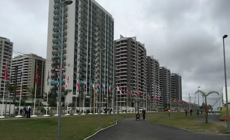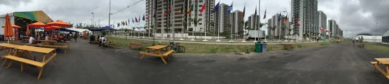 The village was built for the Olympics and Paralympics. It consists of high rise apartments to hold around 18,000 atheletes, officials and trainers. There are also a series of large tents set up for Dining, Medical, Gym and offices. Flags from each country lined the main road, and the apartments were separated by a grassy park with logos and statues for great pictures.